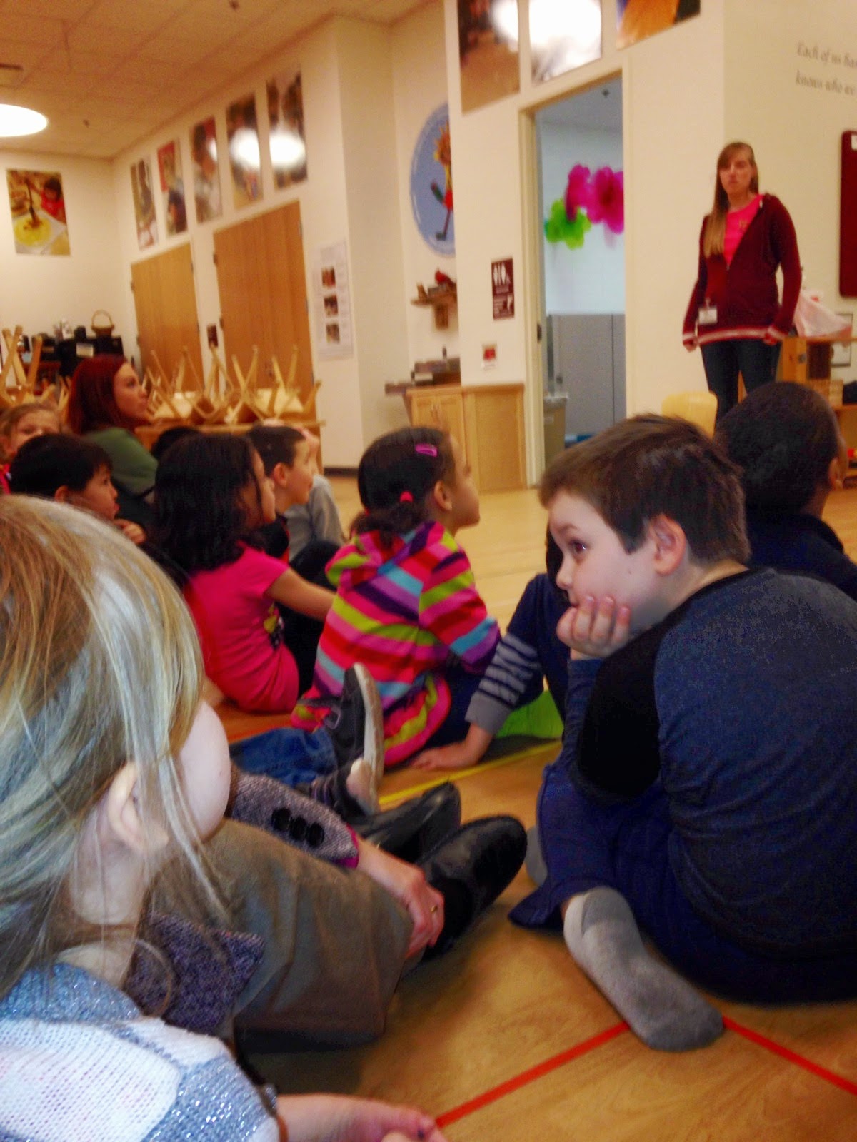 Today a couple of the 409 teachers put on a special play for the whole school. Instead of having our normal afternoon group everyone gathered in the indoor movement room and watched as our very own teachers performed a heartfelt production. The students were engaged as they listened, and watched Ms. Schubert, Ms. Nolan, and Ms.Wright talk about how when we do certain things that are considered hurtful, like knocking over someone's structure "crinkle's their heart" or emptied their bucket. They showed by being nice, and using kind words filled each other's buckets instead of making them sad.